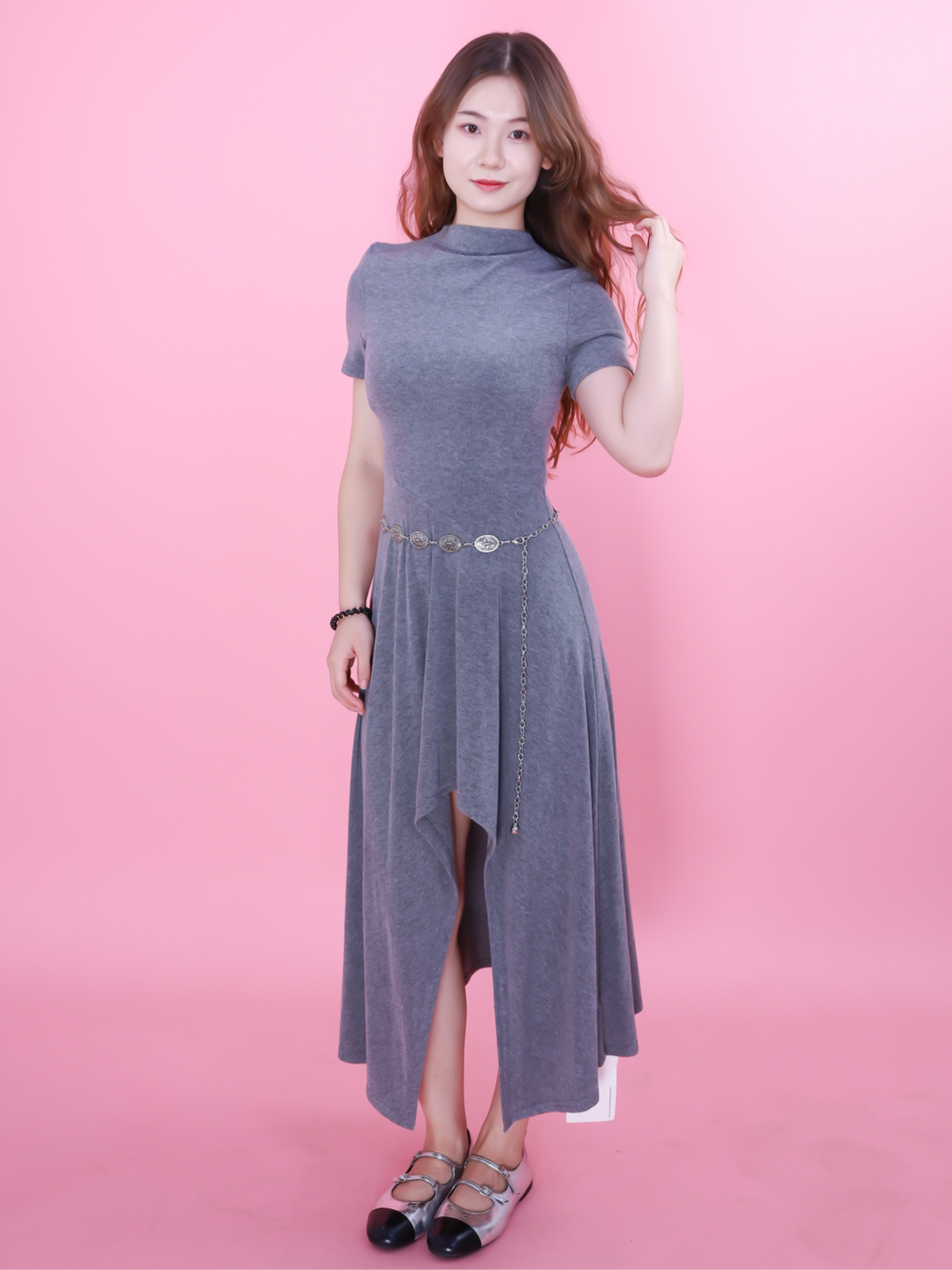 DLKCB2068JPアシンメトリーデザインが上品なハイネック半袖ロングワンピースフレンチテイストでシンプルに着こなせる