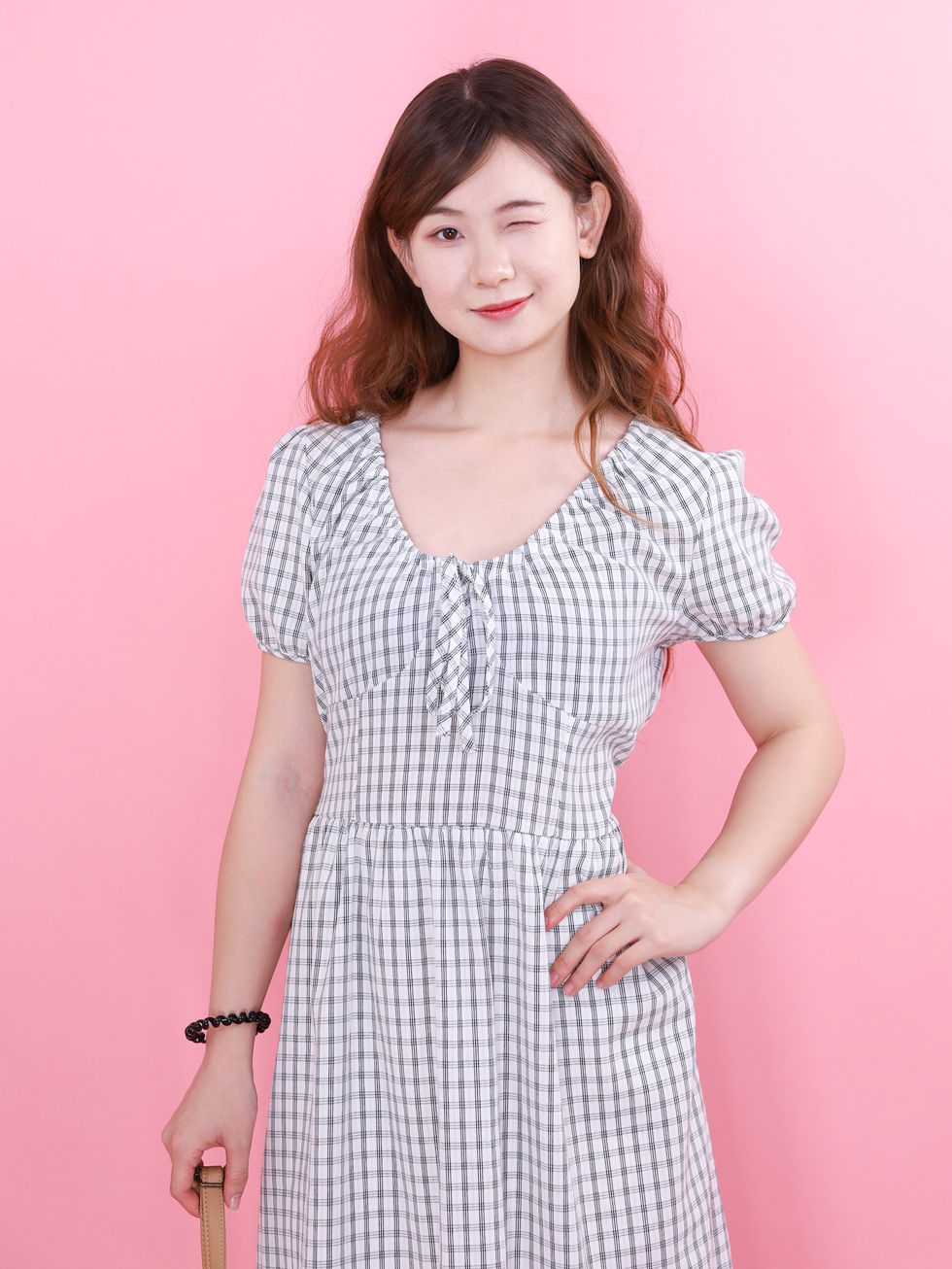 DLKCB2087JP柔らかな雰囲気のギンガムチェックとパフスリーブが可愛いウエスト切り替えAラインワンピース夏のお出かけに