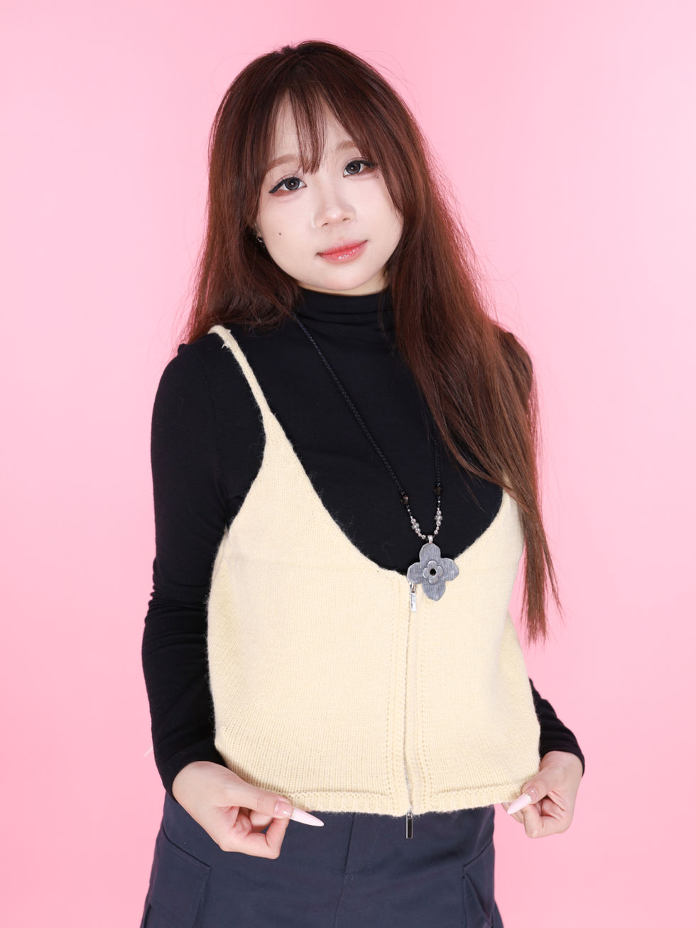 DLKCB2101JPジッパー付きニットキャミソール重ね着用トップス 韓国風甘めデザイン秋向けショート丈上衣