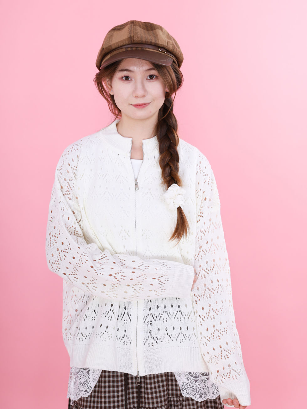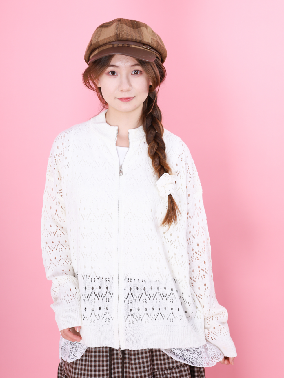 DLKCB2104JPかぎ編み模様ダブルジップニットカーディガン 透かし編み白色初秋向けニット上衣