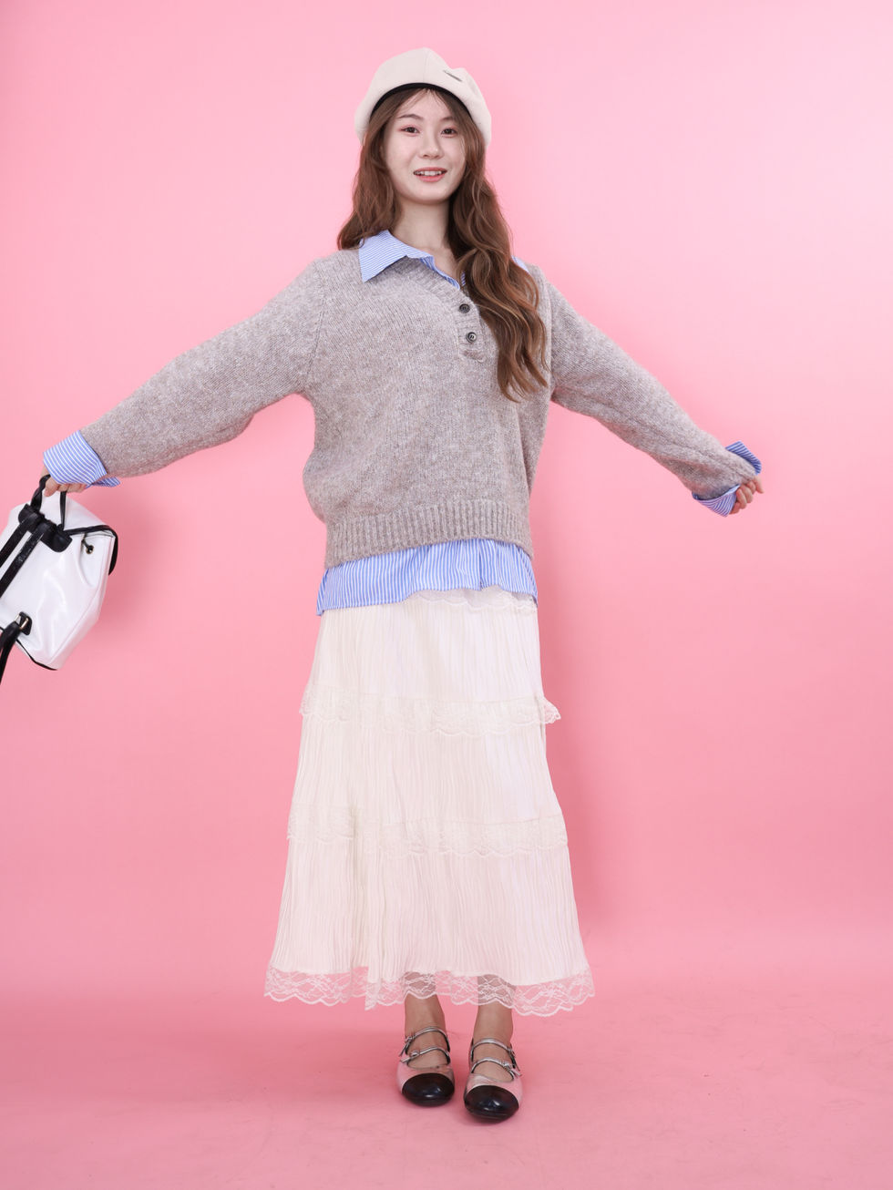 DLKCB2112JP配色デザイン衿付きニットとシャツの重ね着風プルオーバー 秋冬向け長袖レディーストップス