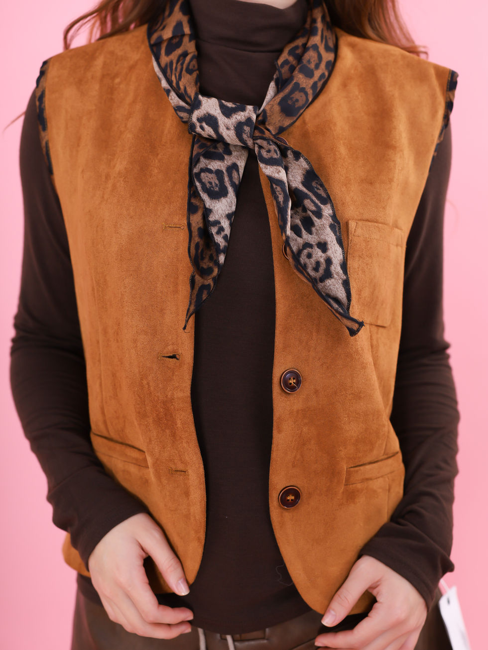 DLKCB2116JP秋のブラウンスエード調Vネックボタンベスト 重ね着にも便利なノースリーブジレ
