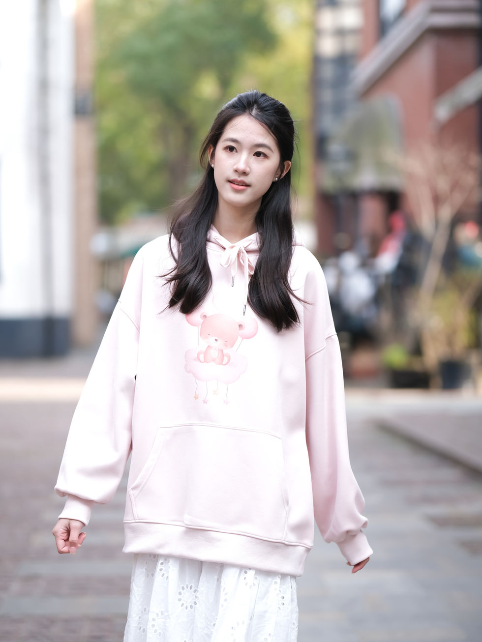 DLKWY0003ふんわり雲とベアモチーフが可愛い ゆったり着られる裏起毛フーディパーカー