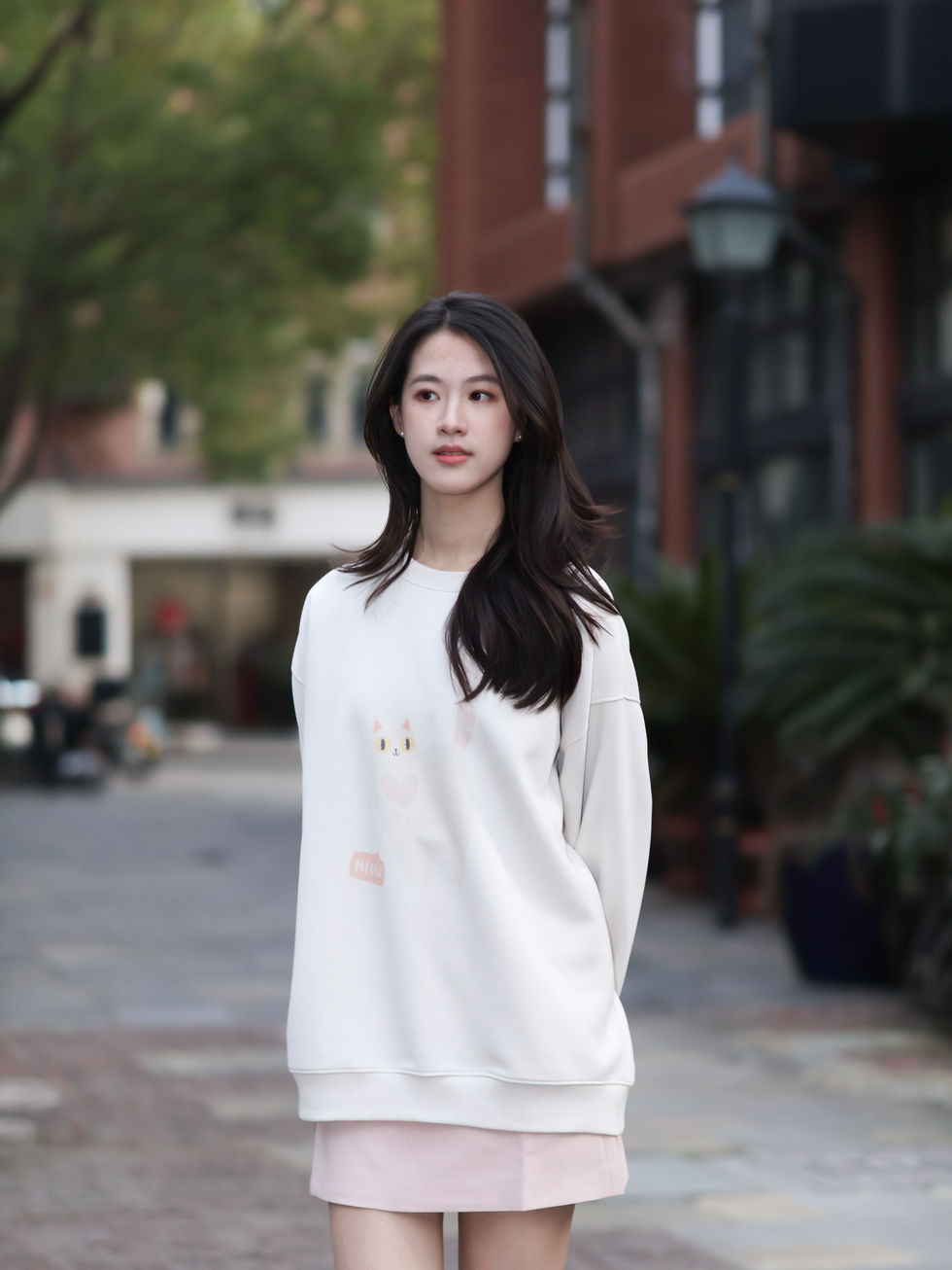 DLKWY0006小さなネコのイラストがポイント やわらか裏起毛のリラックスラウンドネックスウェット