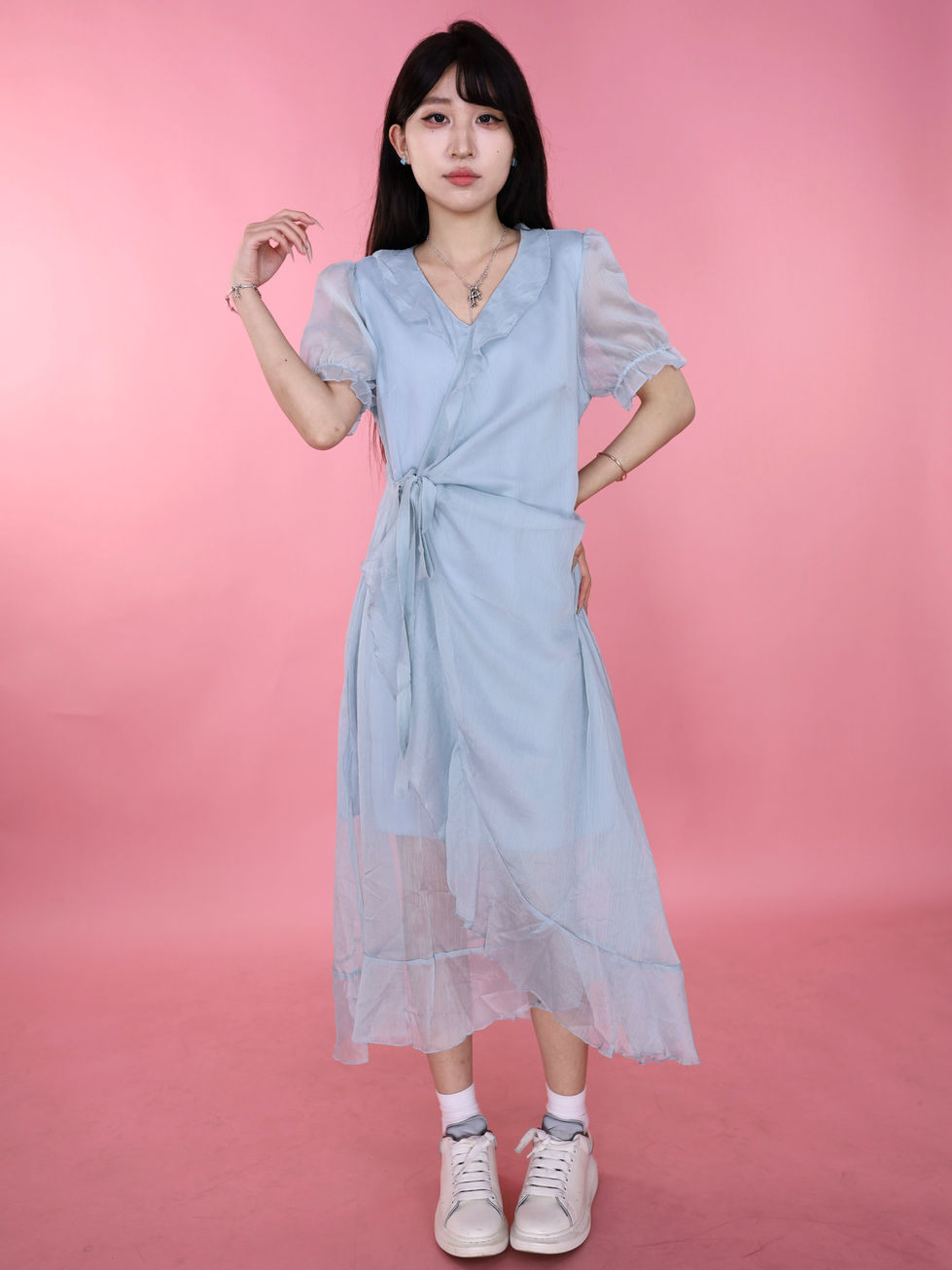 PDLKCB922JPアシンメトリーブルーワンピース夏新作小柄向けフレンチ気質スリム見えワンピ